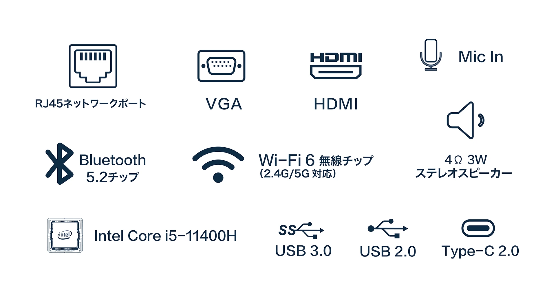 | プロセッサー | Intel Core i5-11400H (Core 6, 2.2GHz, with Turbo Boost up to 4.5GHz, Intel UHD Graphics)、12M キャッシュ、最大 4.50 GHz |
