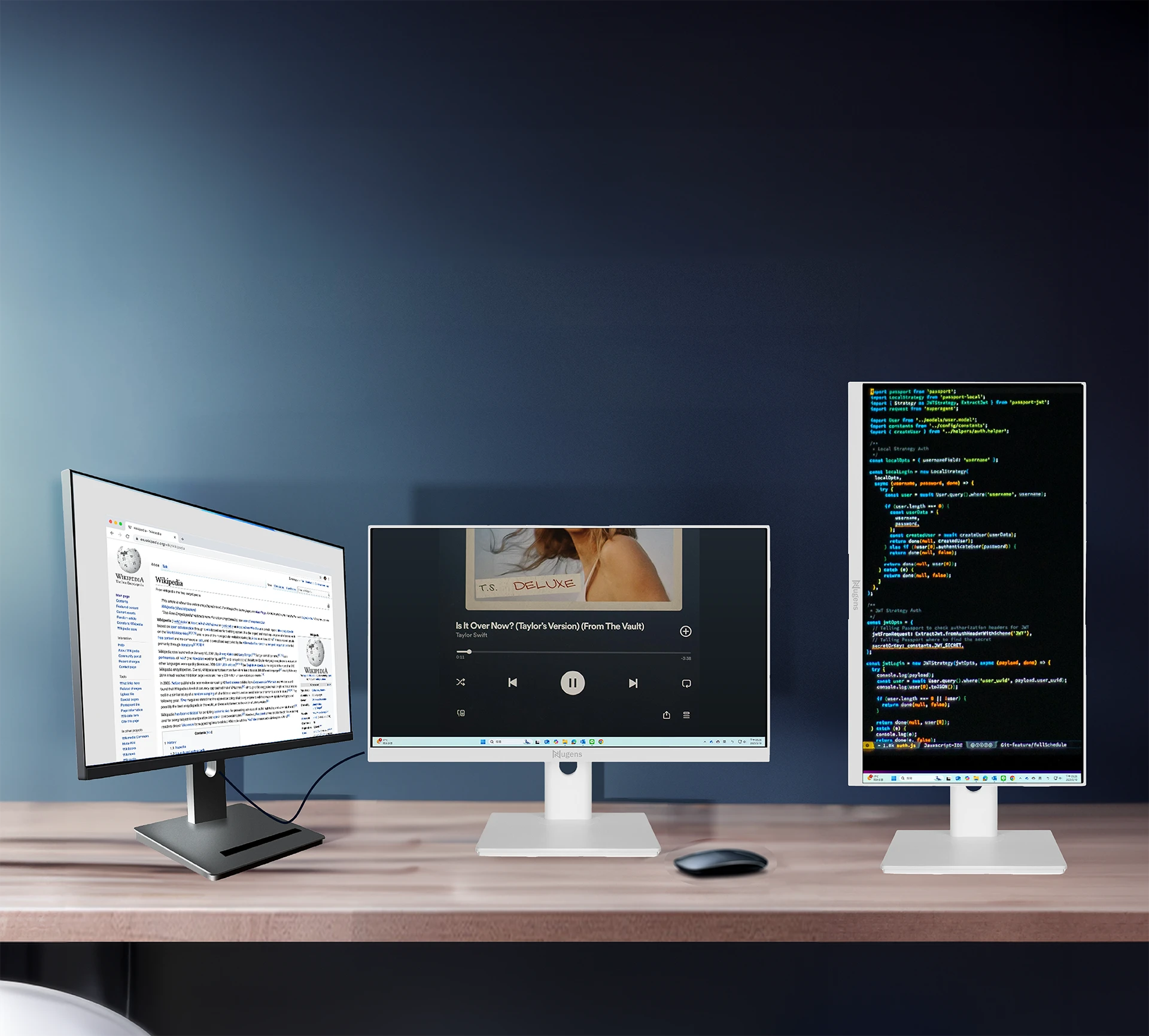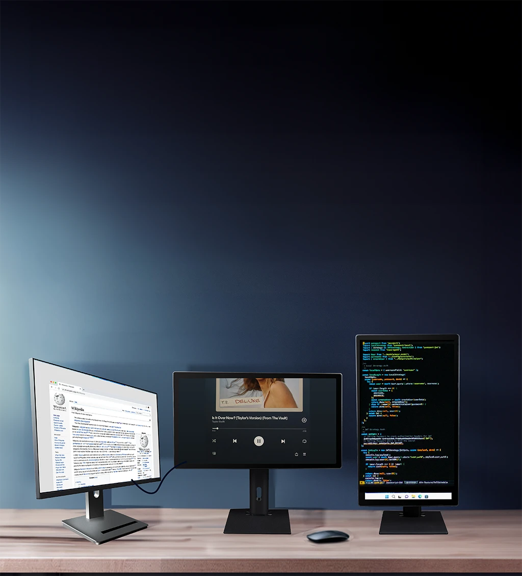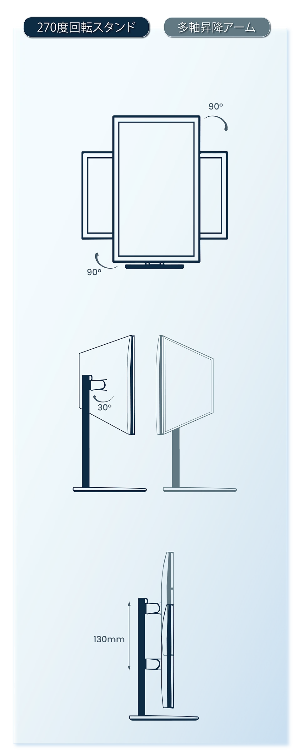 270度回転可能なスタンドと多軸昇降アームを搭載しており、使用ニーズに合わせて自由に画面の角度を調整でき、最適な視覚を提供します。仕事でもエンターテイメントでも快適で、様々な状況に対応できます。