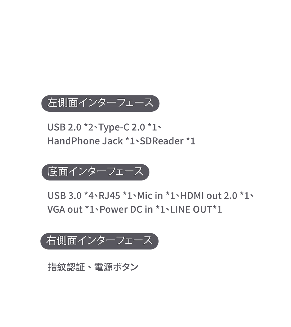 | 側面インターフェース | USB 2.0 x 2、Type-C 2.0 x 2、HandPhone Jack x1、SDReader x1 |